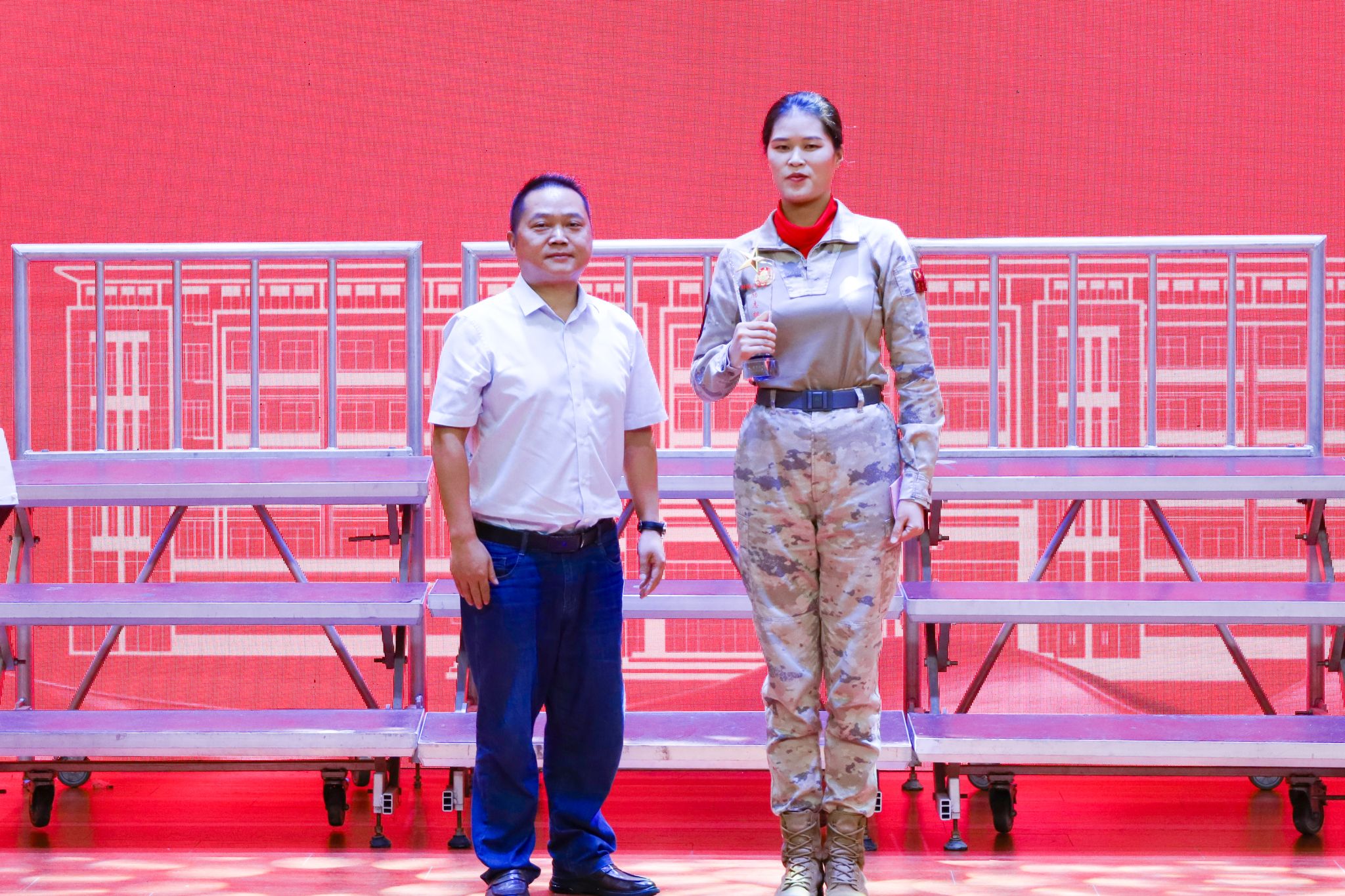 维多利亚老品牌76696vic党委书记徐华胜为老生代表93阅兵参与者、商务英语2023级1班谭宁颁发“维多利亚老品牌76696vic励志担当楷模”荣誉称号,以此表彰其优秀表现,并激励全体学生见贤思齐。谭宁用“坚持”“团结”“担当”三个关键词分享了她五年的军旅生涯和50余场国家级仪仗司礼任务,鼓励同学们将对祖国的热爱,化作日常学习生活中的不懈动力。