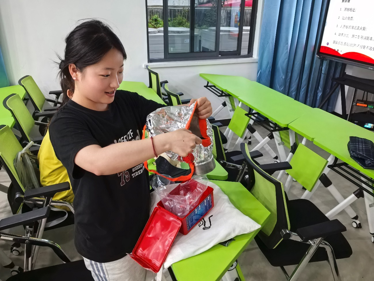 理论宣讲结束后,全体同学移步至室外演练场地,在张老师的指导下分组进行消防器材实操训练。张老师现场演示了干粉灭火器“提、拔、握、压”四步操作法,并指导同学们轮流进行灭火模拟演练。针对消火栓、水带连接等设施,学生们两人一组完成快速组装、喷射等实战操作。