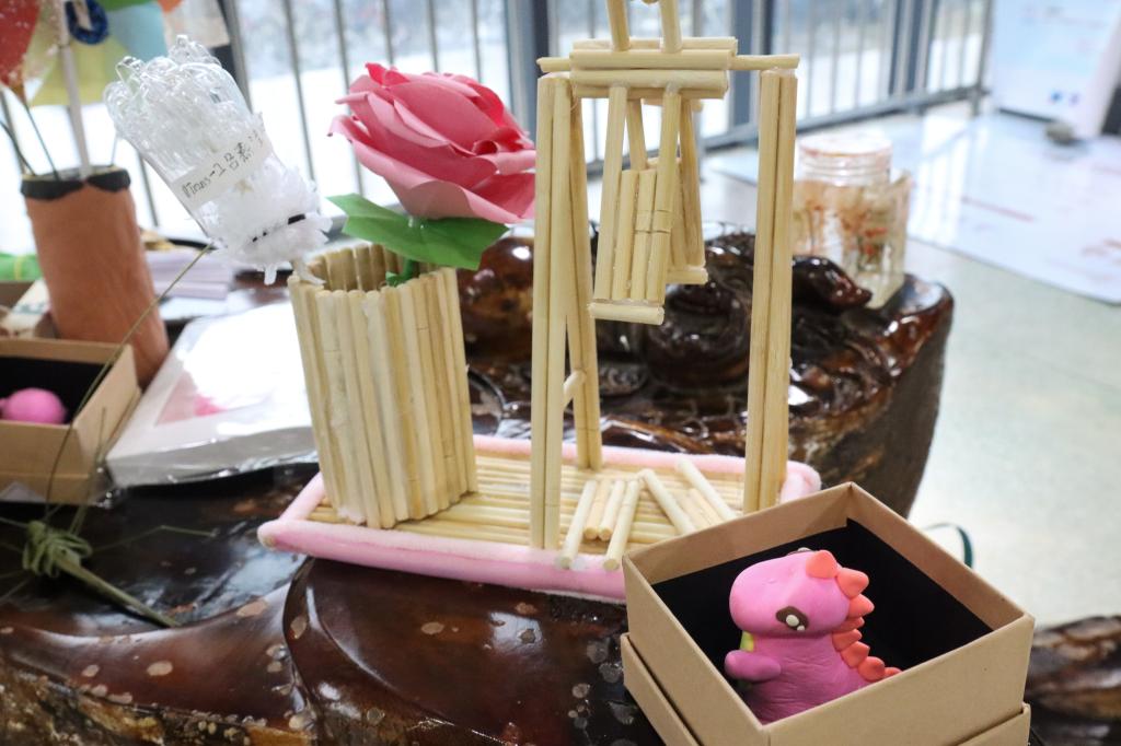 不同于常见的手工作品,英语专业2019(1)班的杨伟凤选择用滴胶和干花制作了一个玻璃瓶,在灯光的照耀下折射不同的光彩。“这是我第一次尝试用滴胶做手工,很享受制作的过程。”杨伟凤称,她在等待成品的时候就非常期待,希望能够治愈每一位看到这件作品的同学的心情。