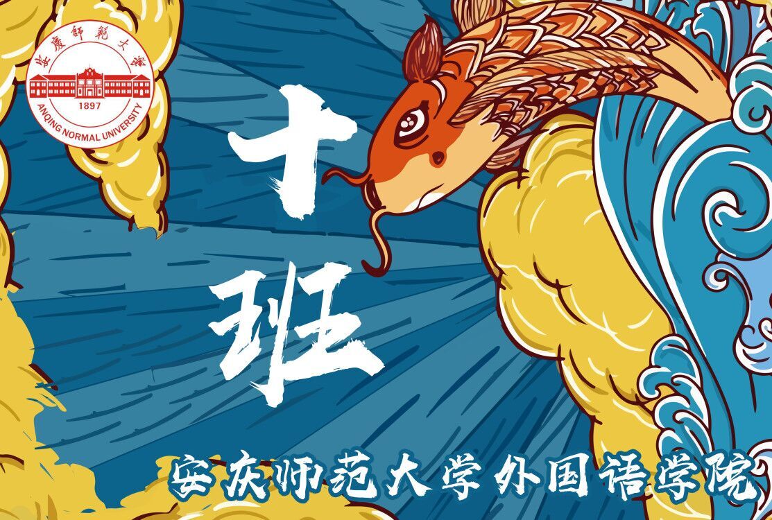 强烈的色彩对比带来的视觉冲击,是英语专业2020(10)班设计的班旗的最大特色,简单的红黄蓝三种颜色在鲤鱼跃龙门的主题下得到了完美的协调。在被问到设计过程中遇到的困难时,英语专业2020(10)班的康建军说:“符合背景的字体很难找到,我花了两天时间从网上找到合适的字体,跟其他几位同学共同商讨以后才最终定稿。”