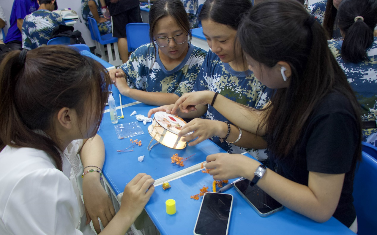 漆扇不仅承载着古人的智慧与匠心,更寓意着团圆与和谐,成为中秋佳节不可或缺的文化符号。在漆扇制作环节,同学们分成小组,迫不及待地投入其中。现场,他们共同讨论如何挑选扇骨、搭配颜料以及绘制图案等步骤。在绘制图案的过程中,他们或挥毫泼墨,或细心勾勒,将心中的美好愿景化作扇面上的艺术佳作。大家逐渐体会到了漆扇制作的不易与乐趣。一幅幅精美的漆扇在他们手中诞生,每一幅都凝聚着他们的心血与智慧。
