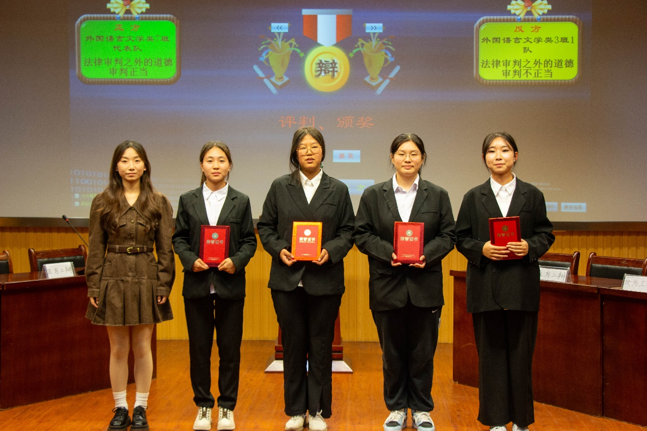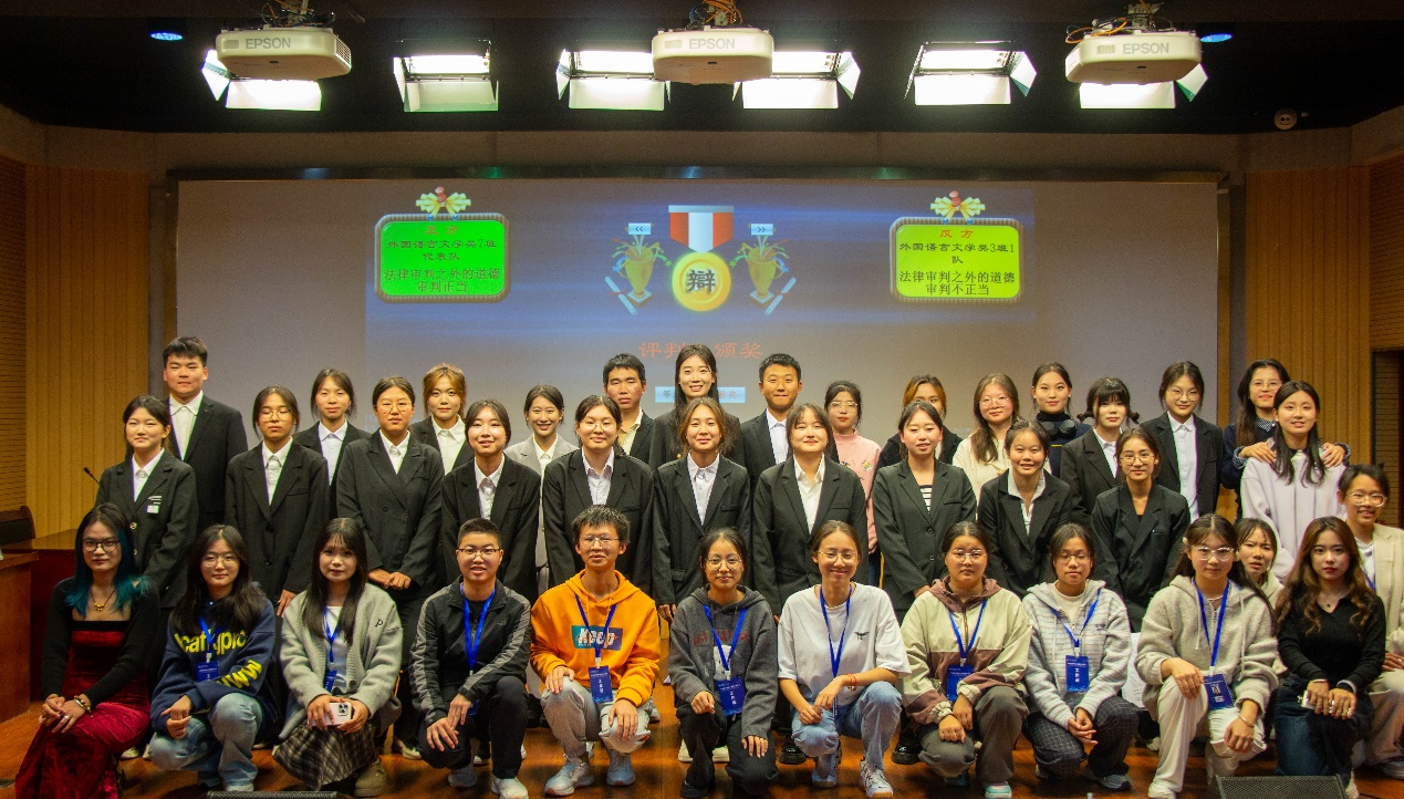 本次辩论赛共分为立论、质询、驳论及对辩、盘问及盘问小结、自由辩论、结辩和观众提问六个阶段。经过激烈对决,2024级外国语言文学类(3)班1队获得冠军,2024级外国语言文学类(7)班获得亚军,2024级外国语言文学类(3)班2队获得季军。2024级外国语言文学类(3)班费陈希、李霏雪两位同学分别获得了金牌辩手和最佳辩手。